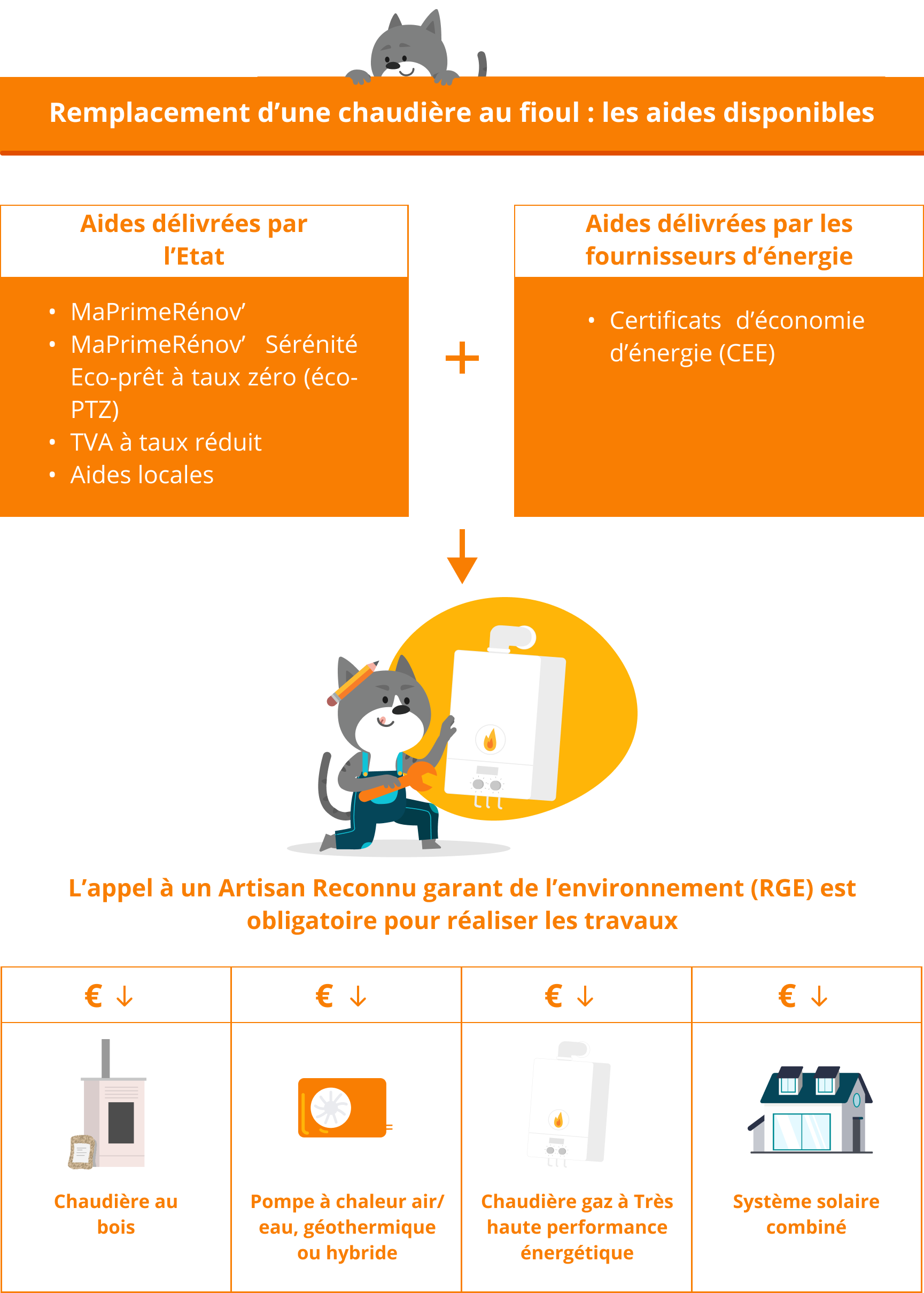 Pour le remplacement d’une chaudière au fioul, vous pouvez bénéficier d’une ou de plusieurs aides à la rénovation, à la condition de confier la réalisation des travaux à un artisan Reconnu garant de l’environnement (RGE). Parmi les dispositifs disponibles, on compte :